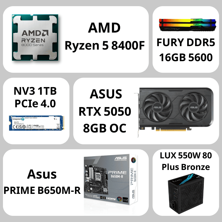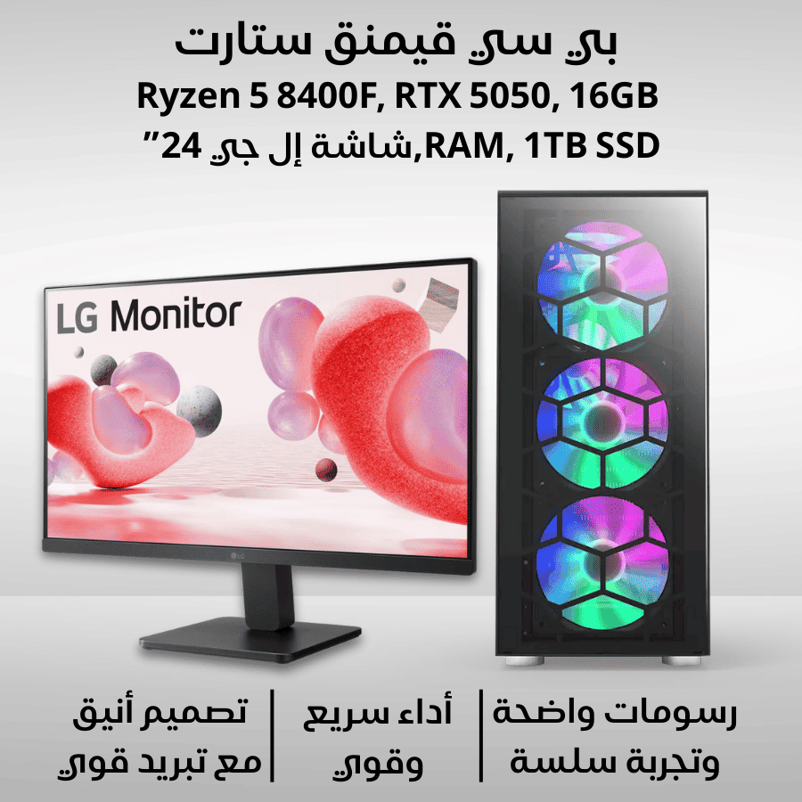 تجميعة بي سي قيمنق نوفا فيوجن AMD Ryzen 5 8400F, RTX 5050, 16GB, 1TB SSD, LG 24″