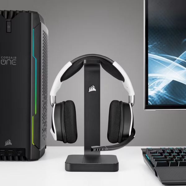 | عرض منظم: ترتيب أنيق للسماعات على المكتب. |