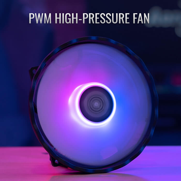 | مروحة ARGB 12 سم: شفرات شفافة مع تحكم بالإضاءة عبر اللوحة أو زر مخصص. |